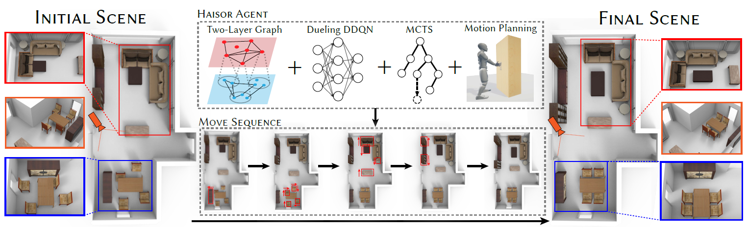 Figure: Given an initial scene, our Haisor agent takes advantage of the scene graph representation, Dueling Double DQN, Monte Carlo Tree Search, and Motion Planning techniques and outputs a sequence of actions. Following these, the scene is optimized towards the goal of high rationality and human affordance. For rationality, we expect that the overall layout of the furniture is realistic, and no collisions between furniture exist. For human affordance, we expect the free space for human activity to be as large as possible, and people can manipulate movable parts of furniture without being blocked.