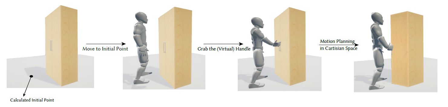 Figure: Human-object Interaction. We use a motion planning pipeline to simulate human manipulating a certain movable part of the furniture. The process is divided into three steps: We estimate the initial standing point of the human using the size of furniture and human, and attempt to place the human model at the initial point. If the placement succeeds, we attempt to move the end-effector of the human to a grasping point of the movable part. If the movement succeeds, we attempt to move the end-effector along the Cartesian path of the movable part (an arc for hinges, a line segment for sliders).