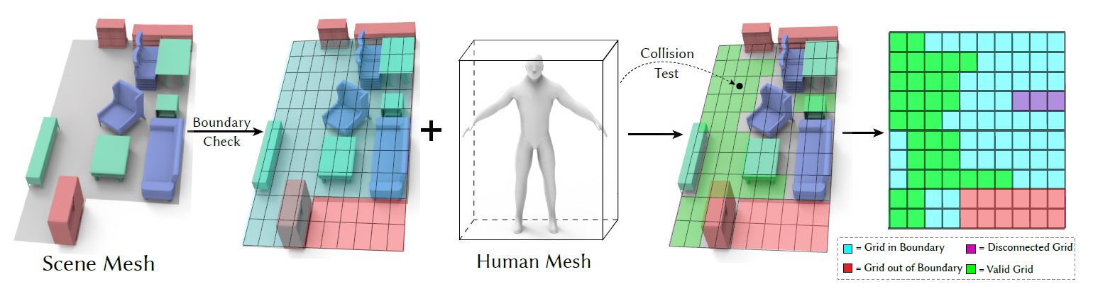 Figure: Free Space for Human Activity. We use uniform grid sampling to compute the free space for human. First, we divide the 2-D bounding box of the floor into 900 grids and compute the grid inside and outside of the floor. For each grid, we attempt to place a human mesh onto its center. If the placement is free of collision, the grid is labeled as valid. Finally, we compute the maximum connected component of the valid grids, and use its size to compute the free space of human activity.