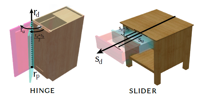 Figure: Types of movable parts. We define two types of movable parts: Hinge and slider. The hinge movable parts are defined using four parameters r_p, r_d, r_u, r_b, and the slider movable parts are defined using three parameters s_d, s_u, s_b. These parameters are combined with bounding box parameters, to form the data of the part-level scene graph.