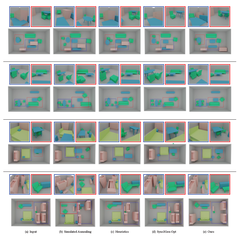 Figure: Comparison of Scene Optimization. We show the comparison of optimization results of our method, random agent, heuristic agent and Sync2gen-Opt [Yang et al. 2021]. From the results, we can see that our method better considers the rationality of the room, the collision between furniture and human affordance of the room simultaneously. For each scene, the first row: the zoom-in view of two particular regions, the corresponding area is labeled by a colored rectangle in the figures of the second row; the second row: top-down view of the whole scene. For each row, left to right: Input scene, results of random optimization, results of heuristics optimization, results of Sync2Gen-Opt optimization, and results of our method.