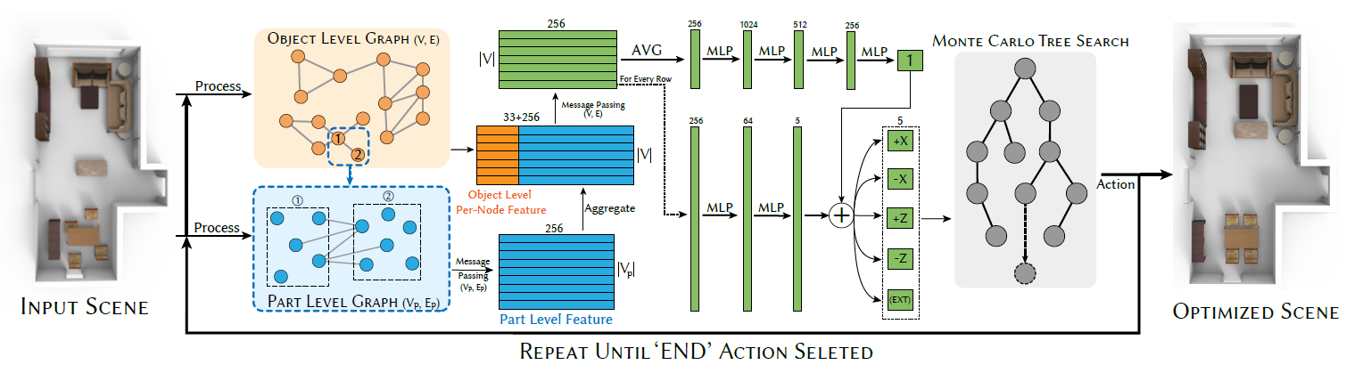 Figure: Overview of Haisor Agent. We use a two-layer scene graph as our representation. The Q-network is based on a message-passing graph network (GCN) on the two-layer graph. In the network, the part-level node feature is fed into a GCN on the part-level graph, aggregated in the object-level graph, and concatenated with the object-level feature. This block of feature is fed into a GCN on the object-level graph and produces the final per-object feature. This feature is the input of two branches of the MLP (Multi-Layer Perceptron) network, following the structure of Dueling Q-network[Wang et al. 2016]. The Q-value is finally used in the searching process in Monte Carlo Tree Search and outputs the final action.
