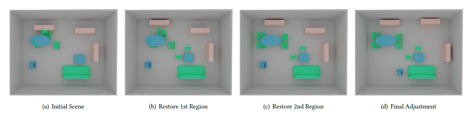 Figure: An Example of Learned Smart Strategy on More Complex Scenes. a) The initial scene with multiple collisions. b) The agent moves the coffee table towards the left direction and moves two stools around the coffee table, forming the first region of table-chairs. c) The agent moves four chairs toward the dining table forming the second region. d) The agent moves cabinets towards the wall and moves the stand towards the sofa to increase the human affordance scores.